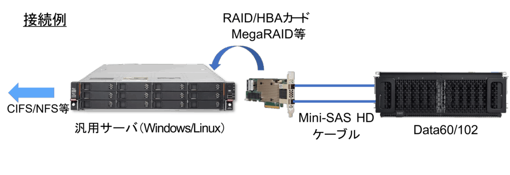 - 汎用サーバのPCIeスロットにRAIDカードやHBAを搭載し、Mini-SAS HD(Data60/102付属)ケーブルで接続します。